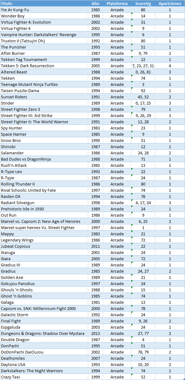 Y de pilón, va la lista de Arcade, probablemente, hay juegos en la lista de arcade que realmente no sean de esa plataforma, de ser así, diganme para actualizar el excel